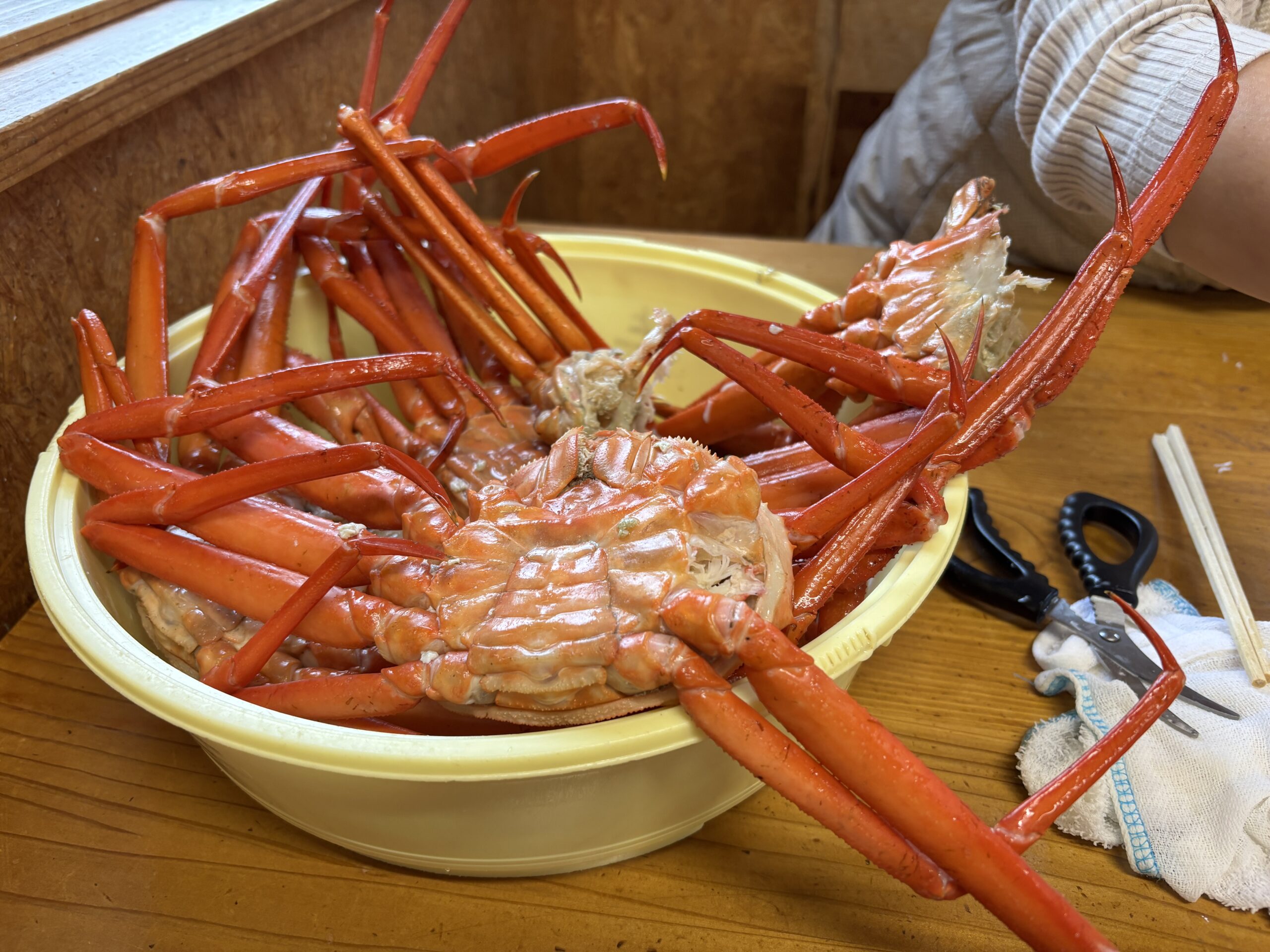 On the way, we stopped off in Kurobe to buy rice and vegetables. It was sunny until Oyashirazu, but then it started raining heavily. We arrived at our destination just after 1:00 PM, and fortunately the rain had stopped. We bought two crabs, but were given about five crabs as a bonus.